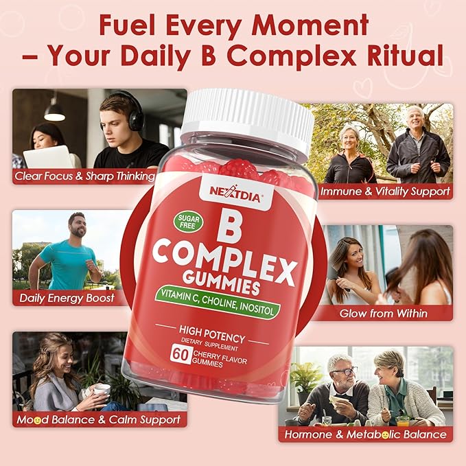 - Superior Potency Vitamin B Complex - Your body needs B-complex vitamins to function optimally. They supports functions such as energy production, metabolism, brain health, heart health and natural prenatal health. Our Nextdia’s formula delivers all 8 essential B vitamins B1, B2, B3, B5, B6, B7, B12 and folate. Also added vitamin C, zinc, choline and inositol, making it the most potent available gummies.