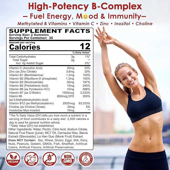 Vitamin B Complex Gummies, Vegan Vitamin B Gummies with 2000 mcg Methyl B12, Methyl Folate | Plus Choline + Inositol, Vitamin C + Zinc for Supports Energy, Mood, Immune, Healthy Hair, Skin - 120 Cts