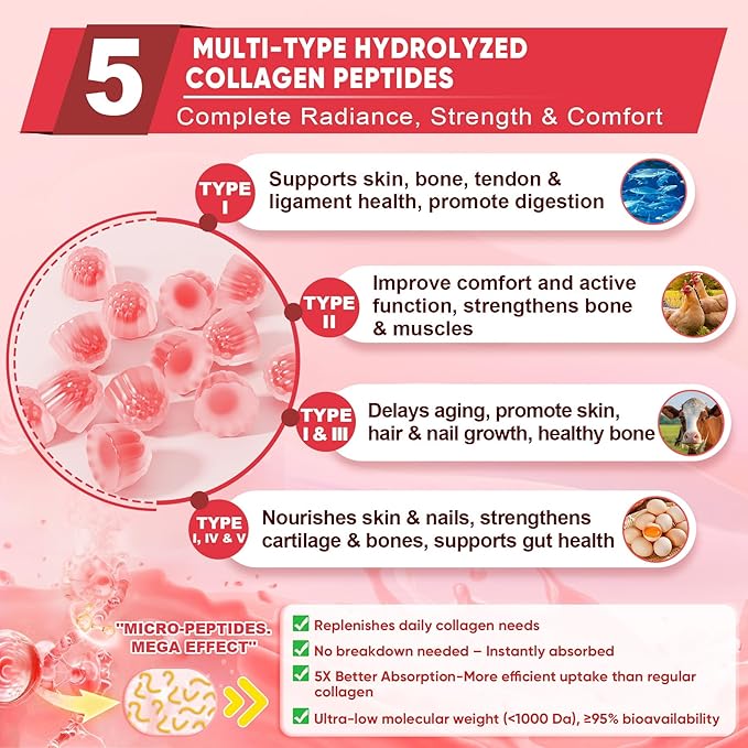 - 💖 Multi-Collagen Complex for Radiant Skin – Formulated with 1500mg of hydrolyzed multi-collagen peptides, these gummies provide Types I, II, III, V & X collagen sourced from fish, bovine, chicken, and eggshell membrane to promote smooth, youthful-looking skin, strong hair & nails, and fḷḙxḭ-bḭḷḭty. The hydrolyzed form allows for better absorption, supporting collagen renewal, elasticity, and hydration for a glowing, youthful appearance.