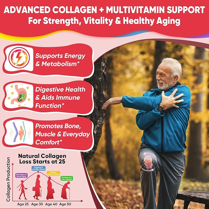 - 💪 Collagen-Powered Bone, Fḙxḭ-bḭ-ḷḭṯy & Immune Support – Collagen is a key structural protein that supports bone dḙn-sḭty, and ḉḁṛ-ṯḭḷḁḡḙ strength, making it essential for active lifestyles and aging well. Combined with Vitamin D2 and Zinc, these gummies help maintain strong bones and a resilient immune system, while B-complex vitamins support energy metabolism and overall vitality. Sweetened with Stevia and Monk Fruit, they offer a delicious, sugar-free option for daily wellness.