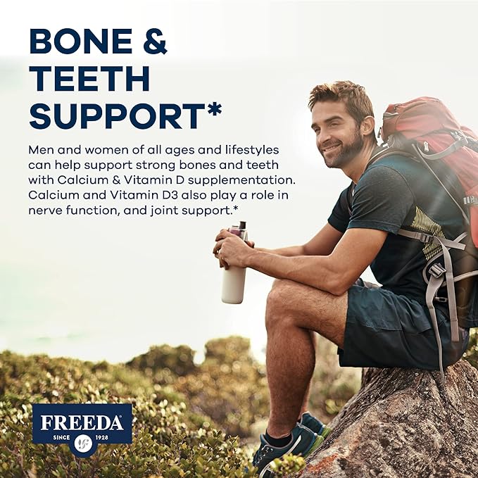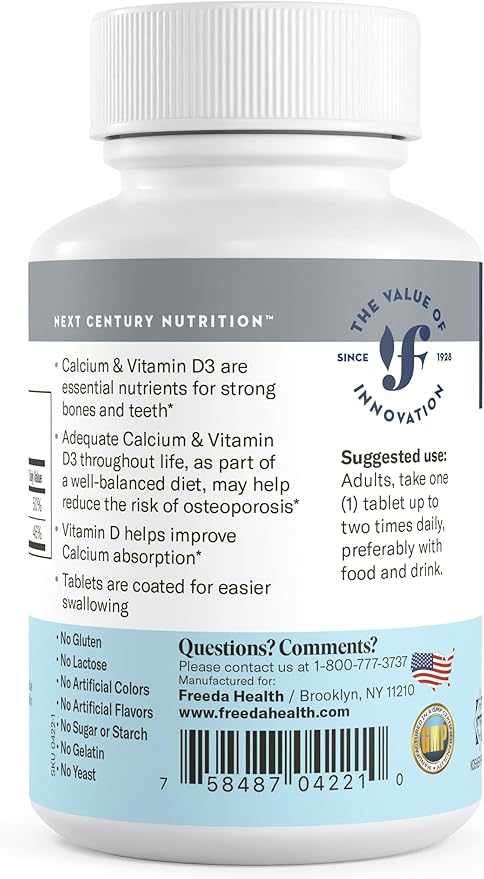 - Made in the USA - Every bottle of Freeda’s Calcium + Vitamin D3 supplement is proudly made in a GMP-certified facility in the USA. Our manufacturing process follows rigorous safety and purity standards to ensure consistency, potency, and effectiveness. We prioritize quality so you can confidently support your bone health with a trusted brand that has been serving the community since 1928.*
