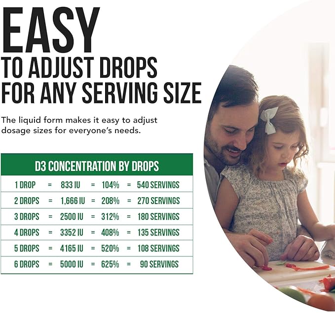 - Max Strength 5000 IU Yet Easy to Adjust Doses: MAX STRENGTH 5000 iu - YET EASY TO ADJUST DOSES:6 single drops of our liquid vitamin D delivers 5000 IU. Doses are also easy to adjust if you desire a smaller or larger amount. The adjustable doses make it easy to administer to children of any age.