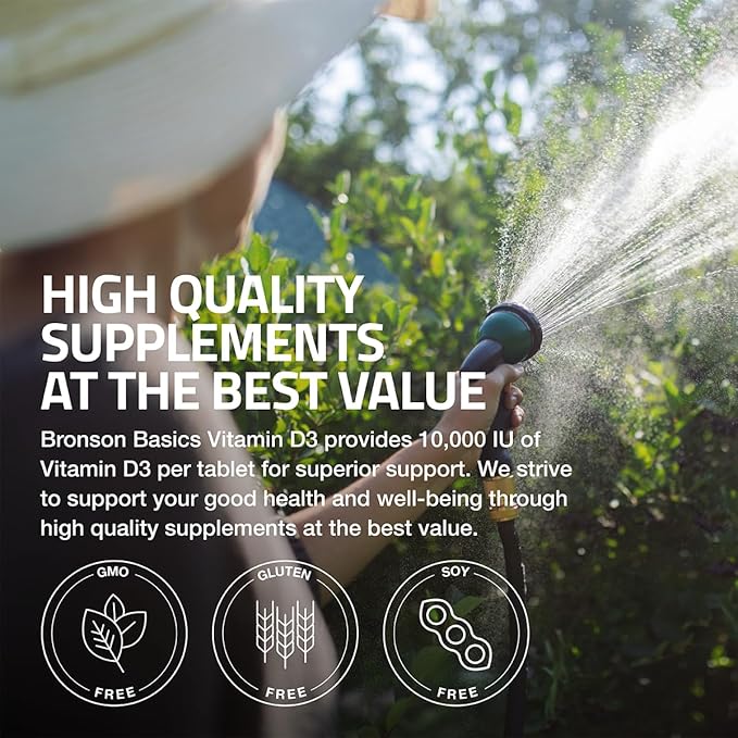 - High Quality & Great Value: Bronson Basics Vitamin D3 provides 10,000 IU of D3 per tablet. We strive to support your good health and well-being through high quality supplements at the best value.