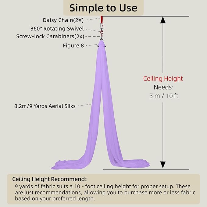 - 【Versatile Application】9-yard/8.2m size fits 3.28 yards/3m home ceilings and professional spaces. Adjustable hanging length suits kids' aerial yoga, adult workouts, and stage shows—enhances strength, flexibility, and self-expression.