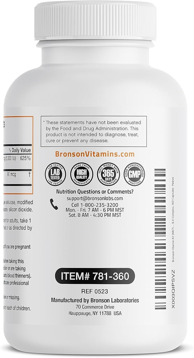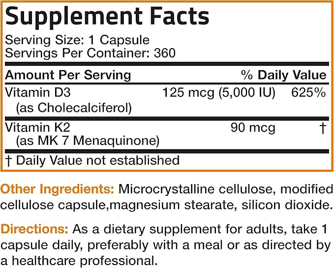 Bronson Vitamin K2 (MK7) with D3 Supplement Non-GMO Formula 5000 IU Vitamin D3 & 90 mcg K2 MK-7 Easy to Swallow D & K Complex, 360 Capsules