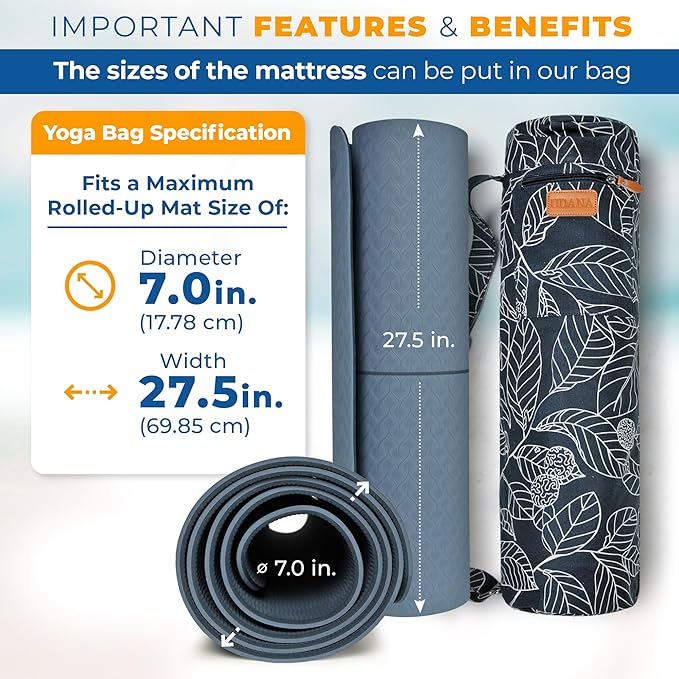 - 🕉️LARGE YOGA MAT BAG: Fits a wide range of yoga mats, From standard yoga mat to large workout mats, this yoga bag is engineered to fit yoga mats with a maximum rolled-up diameter of 7.0 inches (17.78 cm) and a width of 27.5 inches (69.85 cm)