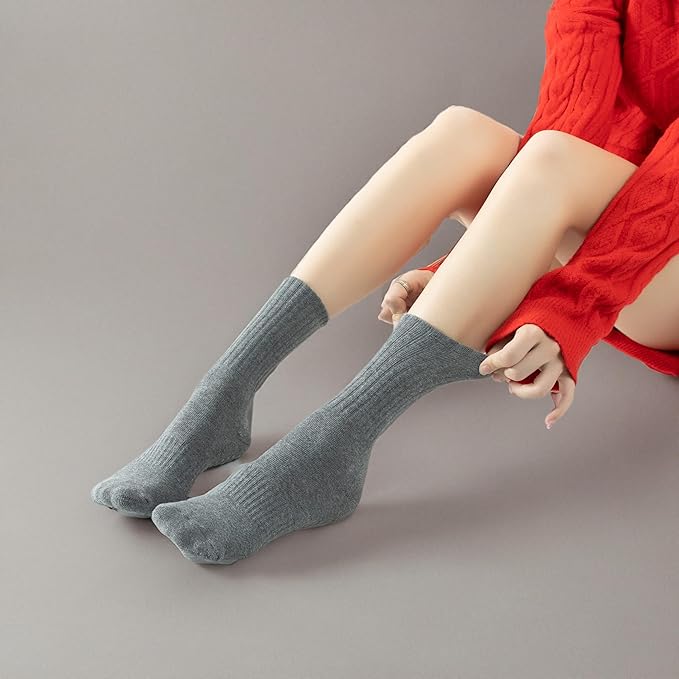 Yoga Pilates Socks with Grips for Women Non Slip Solid Colored Fleece Cushioned Mid Calf Crew Socks for Barre Ballet Dance