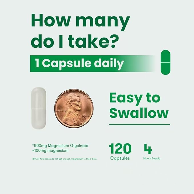 - [ How to Use ] Take 1 serving 500mg daily. 1 capsule 1 serving.120 capsules per bottle for 4 months. Or 2 capsules magnesium glycinate 1000mg (equal to 200mg magnesium) as directed by your healthcare professional.