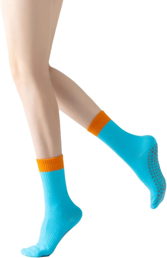 Yoga Pilates Socks with Grips for Women Non Slip Color Blocking Cushioned Crew Socks for Barre Ballet Dance