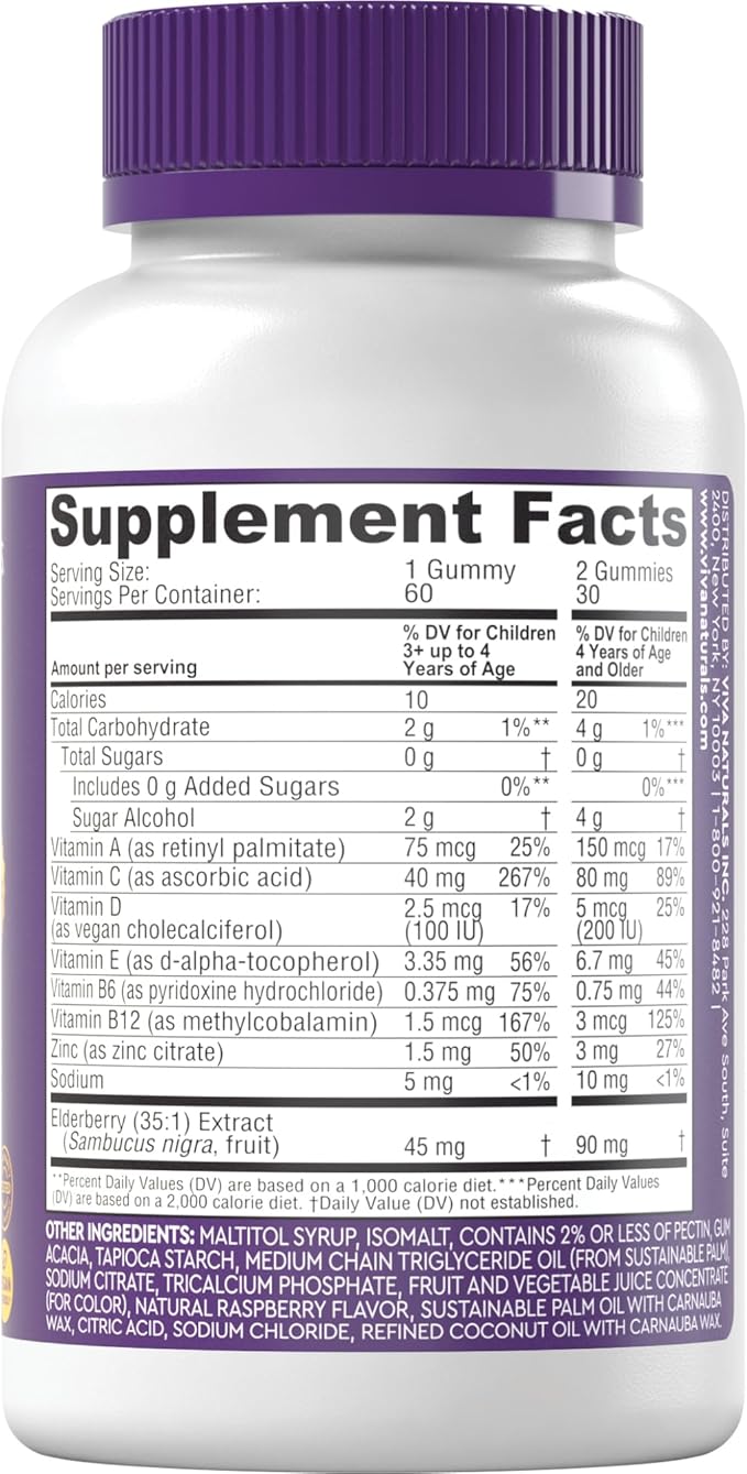 Viva Naturals 8in1 Elderberry Gummies for Kids with Vitamin C, D and Zinc - 60 Sugar Free Kids Immune Support Black Elderberry Gummies - Elderberry Vitamin C and Zinc Immune Support Supplement