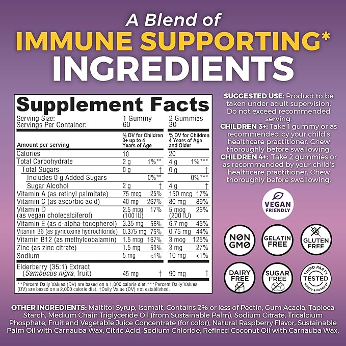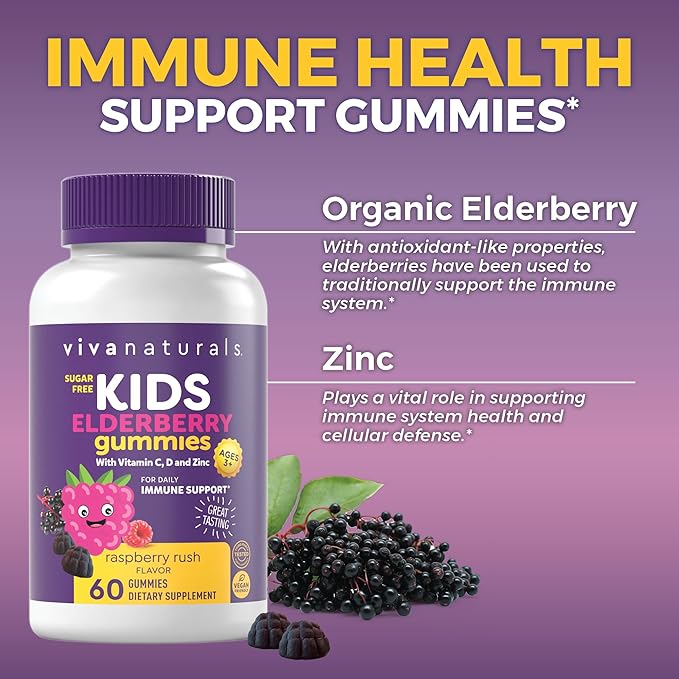 - Elderberry Gummies for Kids - Introducing a delicious kids elderberry gummies, sugar-free way to support your little one's immune system - an 8-in-1 immune support supplement for children* featuring elderberry, zinc, and vitamins A, C, D, E, B6 and B12