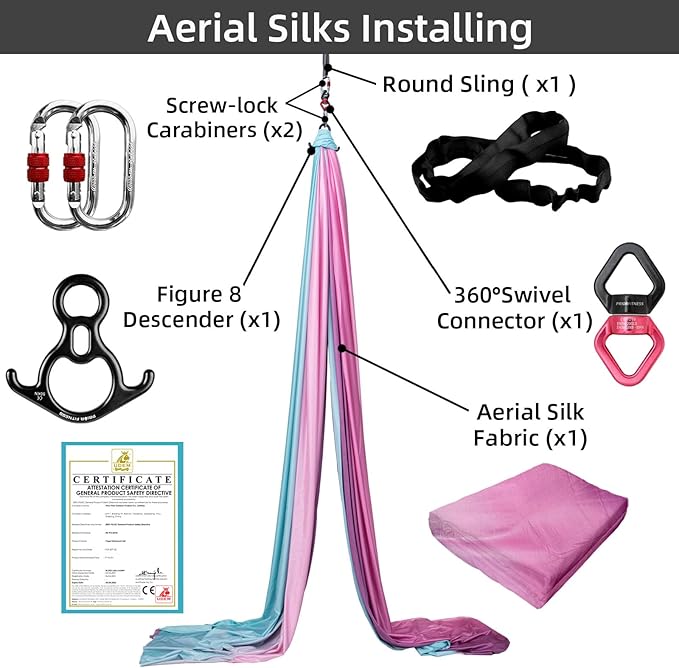 - Suitable for the Occasion and the Crowd:Aerial silks can be used for a variety of artistic and fitness purposes, allowing you to express yourself creatively while improving strength and flexibility.With beginners in mind,this starter set provides a gentle introduction to aerial silks, allowing you to learn at your own pace and progress at a comfortable level.