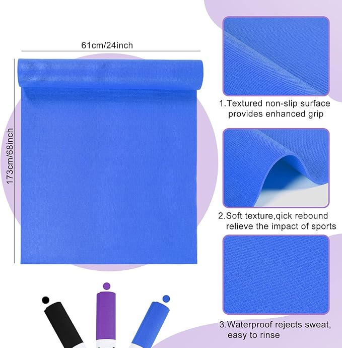 - Portable Size: each fitness mat measures about 68 x 24 inch/ 173 x 61 cm, and 3 mm in thickness, allowing you to practice yoga, Pilates, stretching and so on, suitable for women, men and kids; Lightweight and portable, you can easily take it to the gym or other outdoor occasions