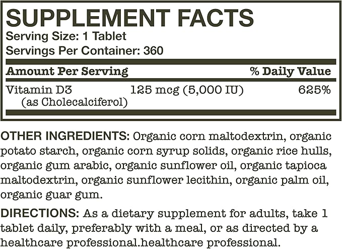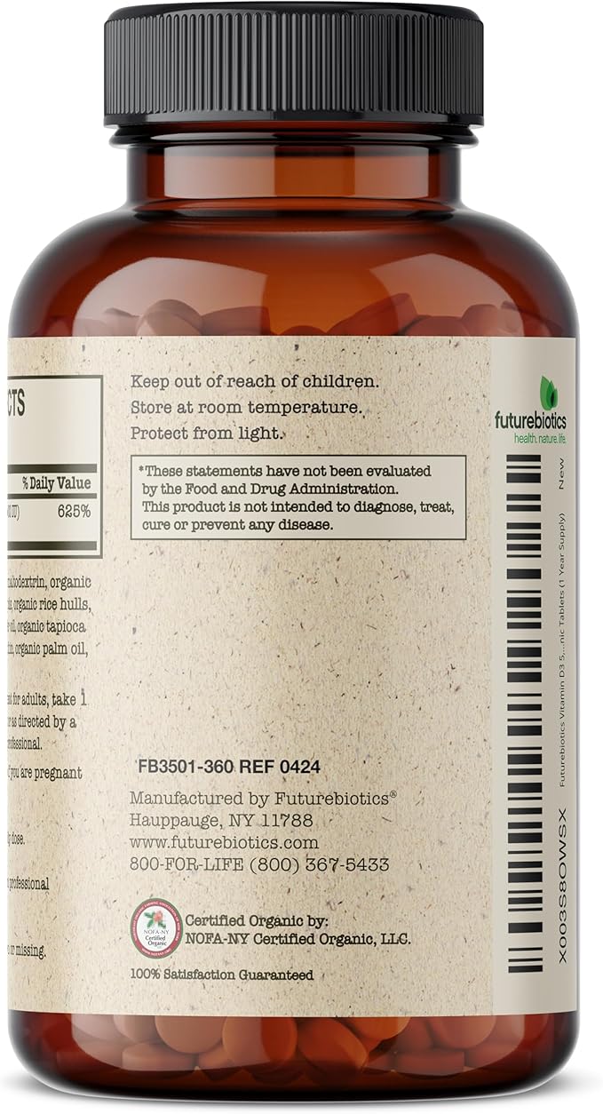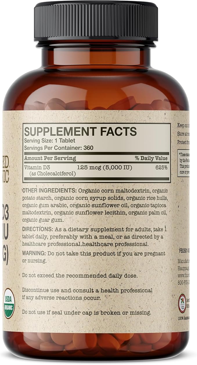 Futurebiotics Vitamin D3 5,000 IU (125 MCG), USDA Certified Organic Vitamin D Supplement, 360 Tablets