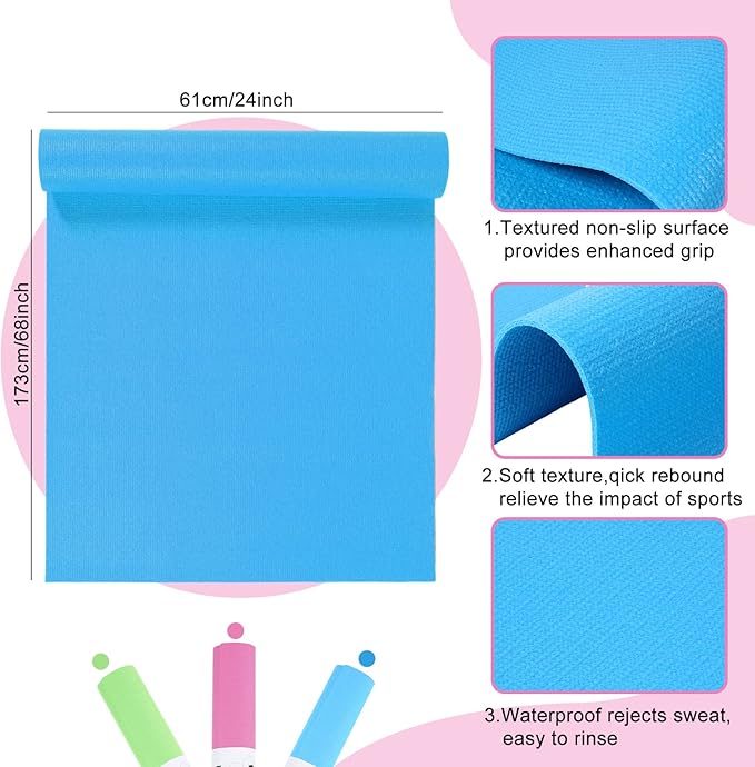- Portable Size: each fitness mat measures about 68 x 24 inch/ 173 x 61 cm, and 3 mm in thickness, allowing you to practice yoga, Pilates, stretching and so on, suitable for women, men and kids; Lightweight and portable, you can easily take it to the gym or other outdoor occasions