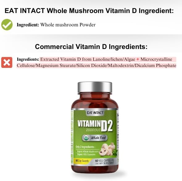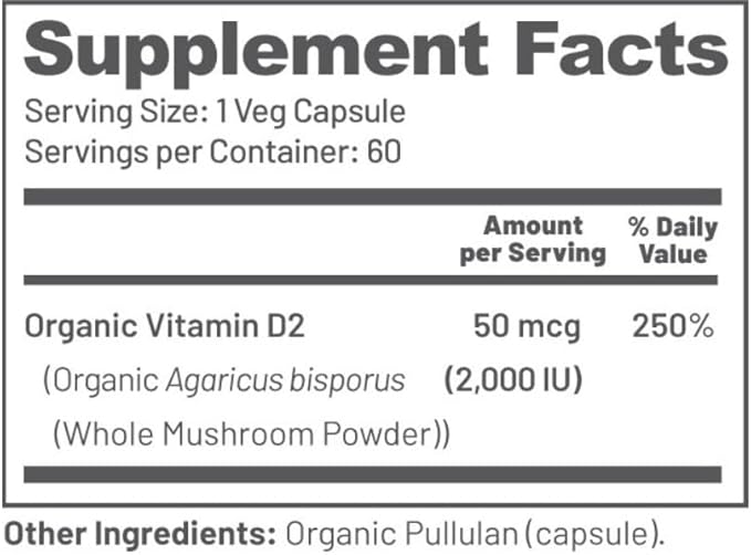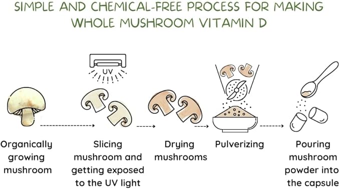 - Organic & Whole Food Derived: Unique vegan Vitamin D sourced entirely from organically grown whole mushrooms, ensuring a genuinely natural supplement perfect for health-conscious, holistic enthusiasts, vegans, and vegetarians.