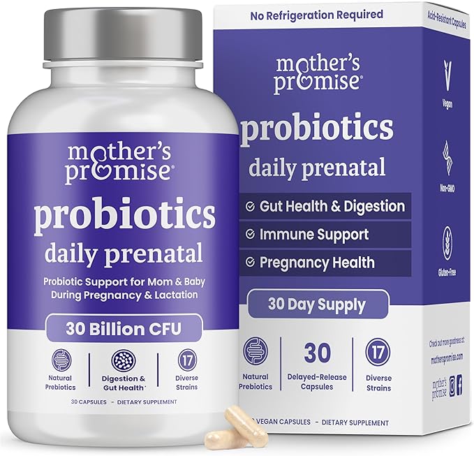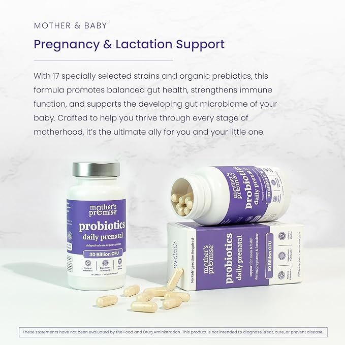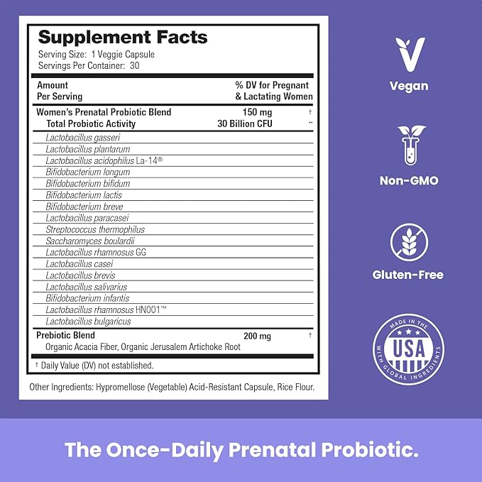 - Once Daily Prenatal Probiotics - Designed specifically for overall feminine & gut health during pregnancy & lactation. One small capsule includes 17 diverse strains (30B CFU) with organic prebiotics to provide you & your baby the support you deserve.