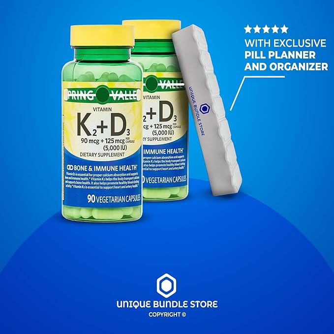 Spring Valley, K2 D3 Vitamin Supplement, 90mcg + 125mcg Vegetarian Capsules 90 Count, Vitamin D3 K2 + 7 Day Pill Organizer Included (Pack of 2)