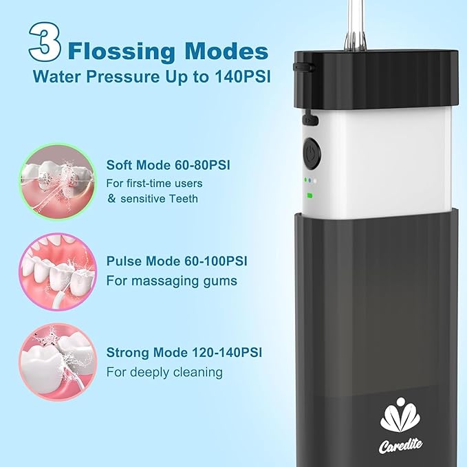 - 3 modes & 4 interchangeable 360°rotating tips for deeply cleaning & improve gum condition-Caredite compact water flosser has 3 flossing pressure settings provide a wider range of intensity options(40-140PSI).Soft Mode 40-70PSI,Pulse Mode 60-110PSI,Strong Mode 120-140PSI.Including 4 replaceable nozzles (including a tongue scraper nozzle), 360° rotating nozzles to remove oral hidden deep, water dental flosser cordless for massaging the gum effectively and promoting blood circulation