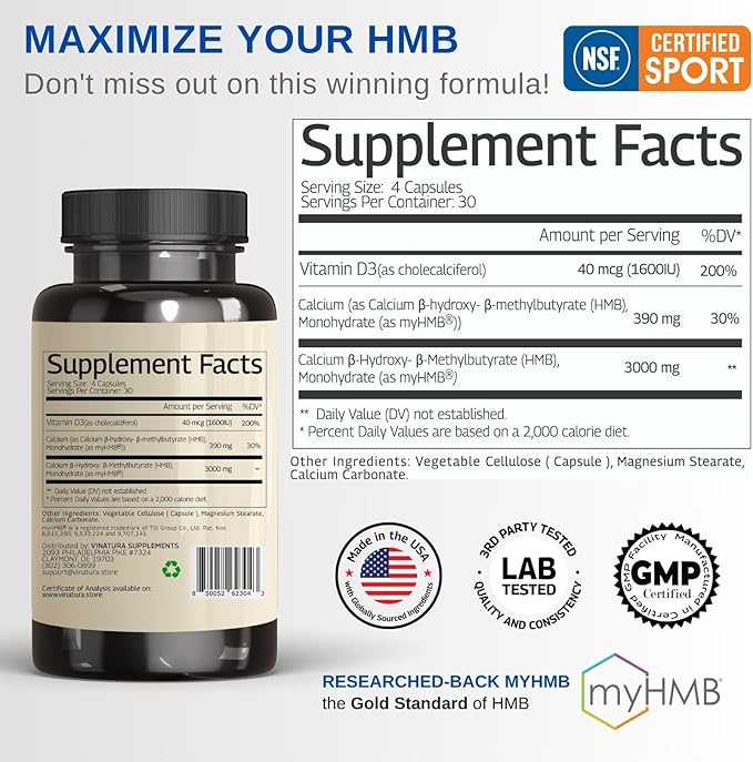 - 3rd-party Tested in USA, Manufactured in USA in a cGMP certified facility: Our hmb and vitamin d3 has been independently tested for quality and purity in the USA. This supplement - the best hmb supplement, is Free of Soy, Tree Nut, Wheat, Dairy.