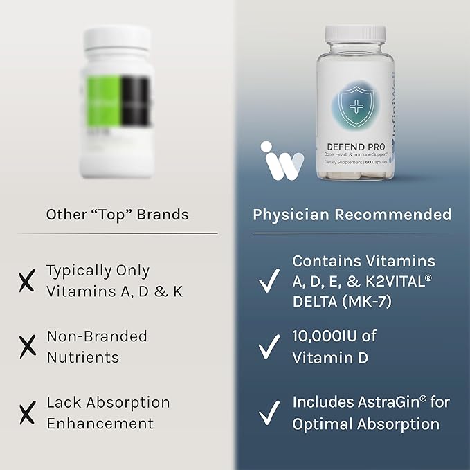 InfiniWell Defend Pro Bone & Immune Support Supplement - Vitamin A, D3 & K2 Supplement - Bioavailable, Active Nutrients - 250mcg VIT D - Aid Bone Strength, Heart Health & More (60 Capsules)