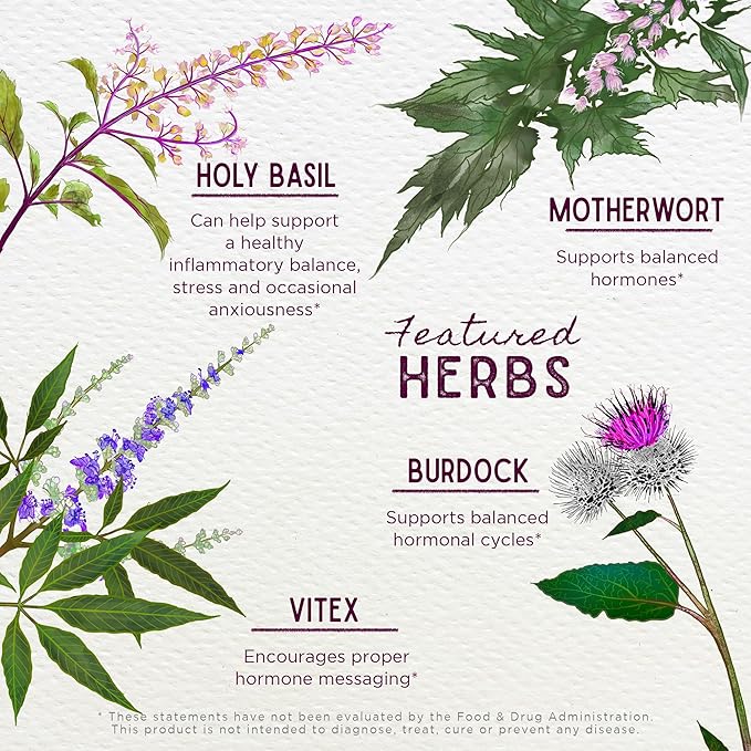 - ORGANIC & WILD-HARVESTED INGREDIENTS: Our staff of highly-trained certified herbalists use only quality-tested, non-GMO ingredients to produce our signature small-batch formulations that support our bodies in the way nature intended. Made with organic vitex berry, black cohosh root, organic motherwort, organic burdock root, oregon grape root, organic holy basil and organic alfalfa leaf. Cycle Vitality I estrogen support supplement for women is gluten-free and vegan.