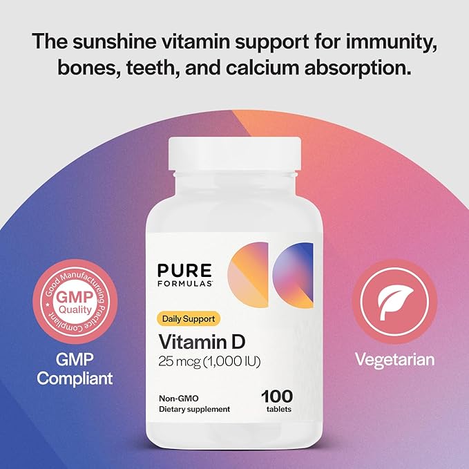 - Sunshine in a tablet: Experience the benefits of the sunshine vitamin without UV exposure. PureFormulas Vitamin D3 1000 IU aids calcium absorption for strong bones and teeth, supports a healthy mood, and bolsters your immune system. Feel your best, every day.