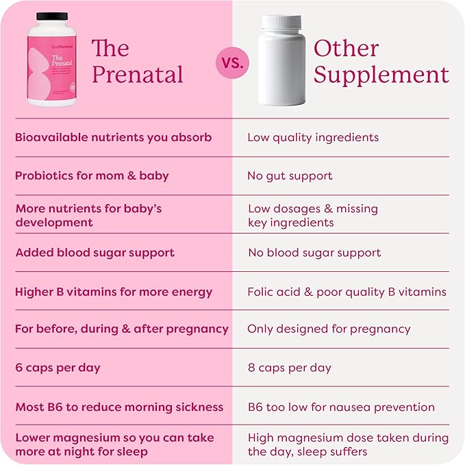 - Prioritize gut health for both mom and baby. Incorporate The Prenatal into your routine ideally 6 months to 1 year before conception. Continue the support throughout pregnancy and postpartum, including breastfeeding. Take 3 capsules with breakfast and 3 capsules with lunch, always with complete meals.
