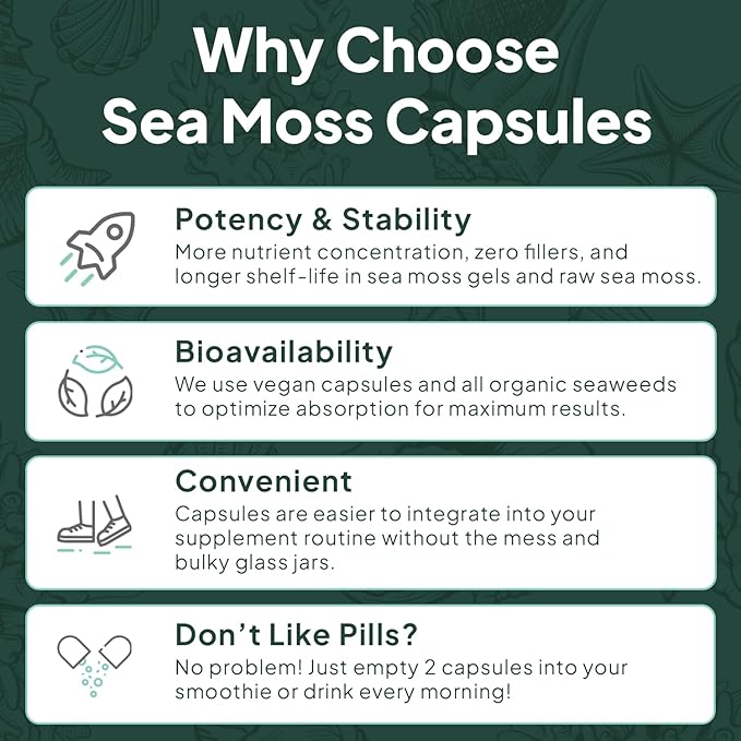 - Powerhouse Thyroid and Lung Support Supplement: Each serving of our organic sea moss capsules is rich in iodine. This is a vital mineral in Organic Oceans’ thyroid supplement for supporting optimal thyroid function. Plus, sea moss’ mucilaginous properties can provide soothing support for clearer airways, so you can breathe easy and conquer the day, every day.