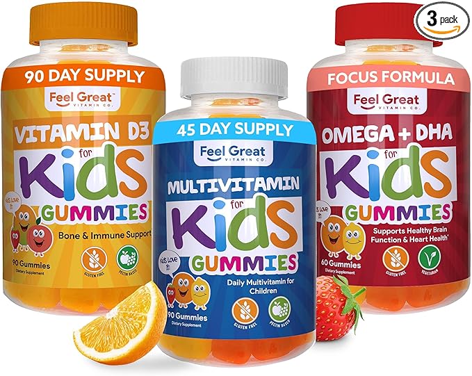 Feel Great Kids Essentail Vitamins Trio - Omega + DHA - Vitamin D - Multivitamin for Wellness & Immune Support