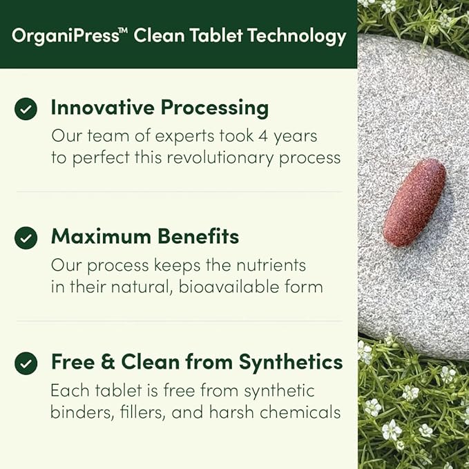 - Clean Tablet Technology: Patented OrganiPress process ensures nutrient integrity, easy digestion, and superior absorption with third-party tested quality.