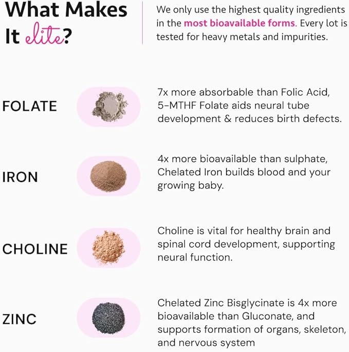 - A prenatal supplement enriched with 1000 mcg of Folate, combined with vitamins K1 & K2, and a gentle form of an iron formulation designed for easy absorption.