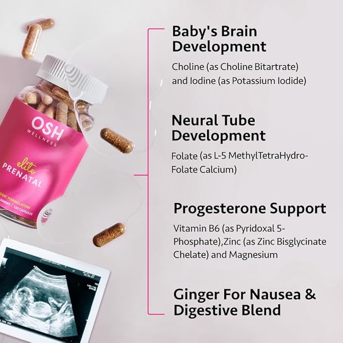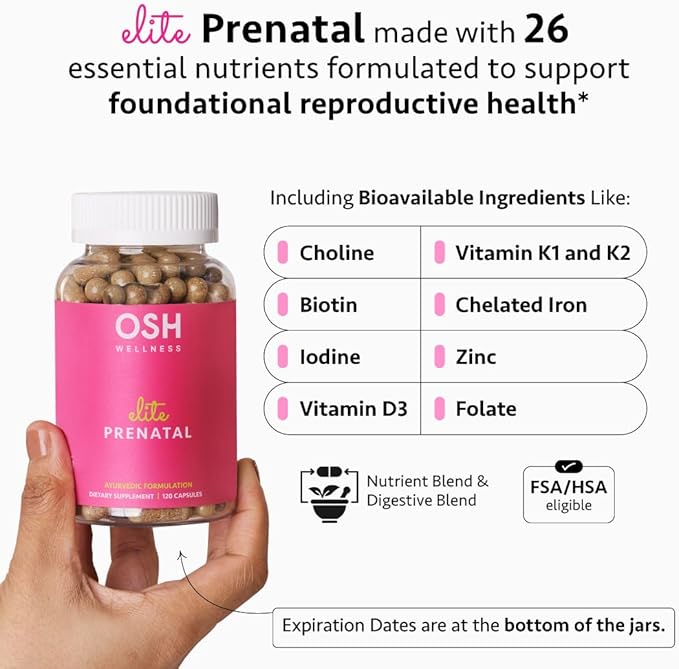 Ayurvedic Elite Prenatal Vitamins with Folate, Choline, Iron, Iodine & more | Made in USA | Optimal Bioavailability | Supports Baby's Growth and Brain Development | 30 Day Supply - OSH Wellness
