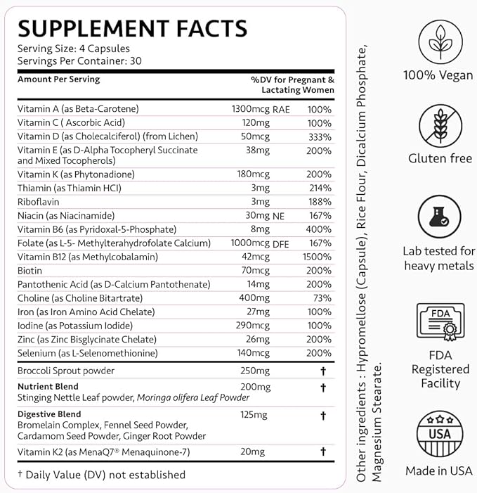 - COMPLETE NUTRITIONAL SUPPORT: Our prenatal vitamins deliver a comprehensive blend of essential nutrients including folate, choline, iron, and a spectrum of vitamins (A, C, D, E, K, B6, B12, and more), ensuring thorough support for both mother and baby throughout pregnancy.