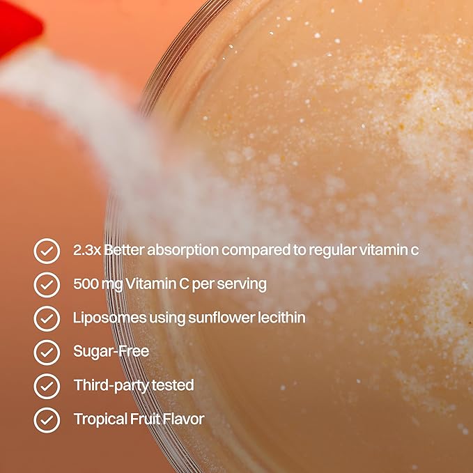Liposomal Vitamin C Powder, Sugar-Free Flavored Packets for Adults, 500mg On-The-go Immune Support Supplement, Powerful Antioxidant, Energy Booster- 30x Packets, Tropical Fruit Flavor