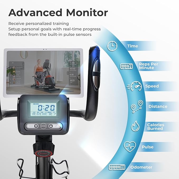 - 【ADVANCED DIGITAL MONITOR】 Personalize your training by setting time, distance, calorie, and heart rate goals. Track progress in real-time with the advanced digital monitor and use the built-in pulse sensor for precise workout metrics.
