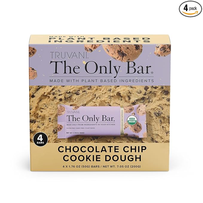 Truvani Plant Based Snack Bars | Chocolate Chip Cookie Dough 4 Pack | 5g Protein | USDA Organic and Vegan | The Only Bar | Dairy, Soy, and Gluten Free | Individually Wrapped