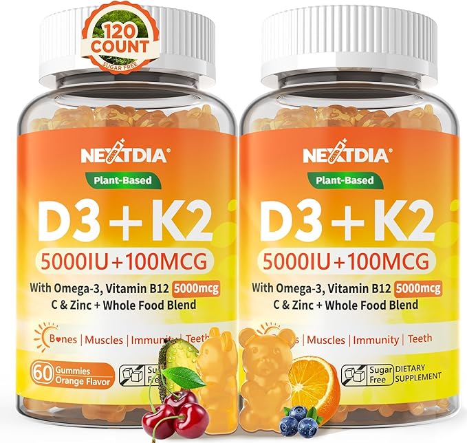 - STRENGTHENING BONES, HĒART, TEETH, & MUSCLES: Following doctors' recommendations, the NEXTDIA formula includes 5000 IU of natural Vitamin D3 and 100 mcg of Vitamin K2, combined with omega-3 extracted from algae. Vitamin D3 promotes the body's absorption of calcium, while Vitamin K2 helps direct calcium from the bl❤odstream to the bones, preventing calcium buildup in the arteries. The addition of omega-3, which reduces infl❤mmation in the arteries and j❤ints, provides comprehensive health support for bones, the cardi❤vascular system, the immune system, and brain function.