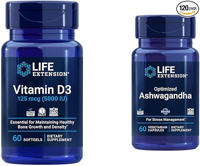 Life Extension Vitamin D3 5000 IU, Ashwagandha - Stress Relief, Focus, Memory, Mood Support - Non-GMO Supplement Bundle