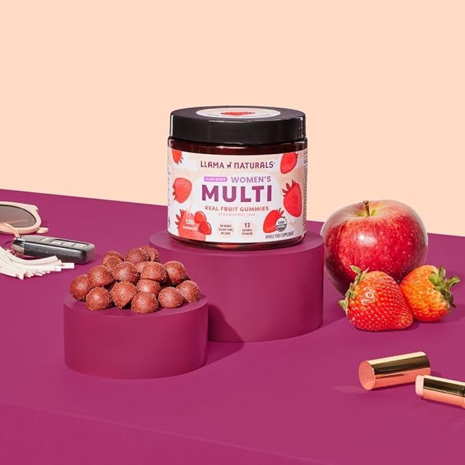 Llama Naturals Multivitamin for Women, Vegan, Organic Gummies with Vitamin D, C and K, Women's Real Fruit Gummy Vitamins, Chewable Multivitamin Supplement, No Added Sugar Cane, Strawberry, 120 Ct