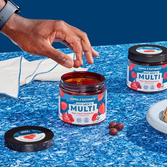 Llama Naturals Multivitamin for Men, Vegan, Organic Gummies with Vitamin D, C and K, Men's Real Fruit Gummy Vitamins, Chewable Multivitamin Supplement, No Added Sugar Cane, Cherry, 120 Ct