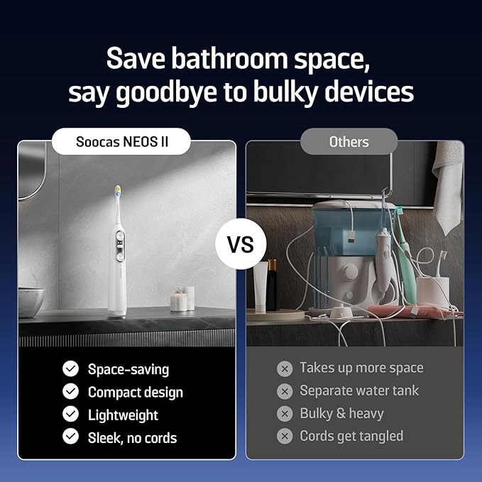 - BRUSH & FLOSS IN ONE GO, SAVE YOUR TIME: Tired of a cluttered counter? The Soocas NEOS II combines a powerful sonic toothbrush and a water dental flosser into one sleek device. This toothbrush and water flosser combination halves your routine, perfect for busy professionals seeking an efficient, smarter clean.