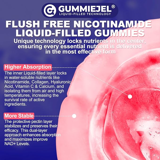 - 【Unique Sugar Free Liquid Filled Gummies】: GummieJel Technology in Nicotinamide gummies allows that inner liquid-filled layer to lock in water-soluble nutrients like Vitamin B3, Hydrolyzed Collagen, Hyaluronic Acid & Vitamin C, while the protective pectin layer stabilizes and preserves their efficacy. This dual-layer approach enhances absorption and maximizes the health benefits. Additionally, it wraps lipophilic nutrients phytoceramides, biotin & vitamin E, making nutrition easier to absorb.