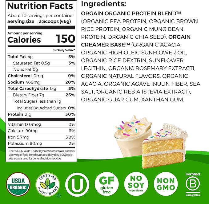 - WHAT TO EXPECT: Includes 1 (1.02 Lb) (10 Servings) ready to mix Orgain Organic Birthday Cake Protein Powder. Each serving contains 150 Calories (2 Scoops)