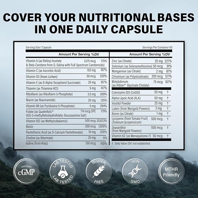 - Comprehensive Nutrient Blend: 27 essential vitamins, minerals & antioxidants in each capsule.