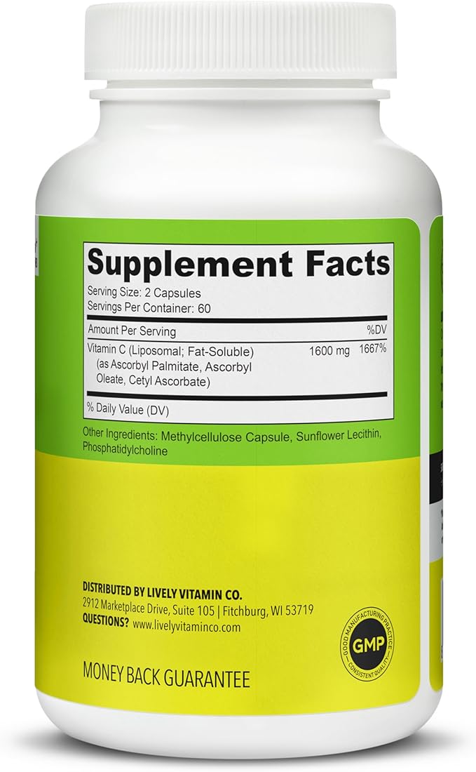 LIVELY VITAMIN CO. Citrus Kick - Liposomal Vitamin C - Sunflower Lecithin - Immune Function - Highly Absorbable - Collagen Synthesis - Eye Health Immunity - Gluten Dairy Soy Free - 120 Capsules
