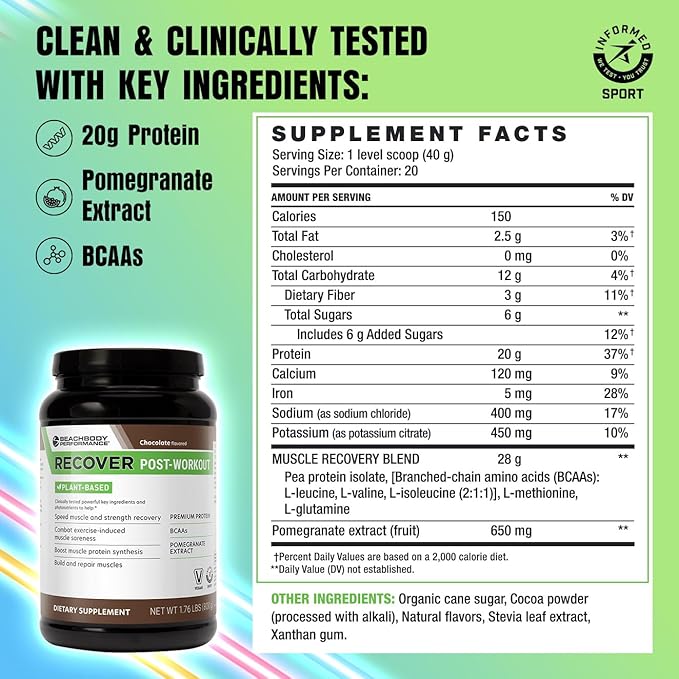 - PURE AND CLEAN NUTRITION: Enjoy an Informed Sport certified product with no synthetic colors, and no artificial flavors, sweeteners, or preservatives. With vegan options available, Beachbody Performance Recover offers a clean, trusted choice for enhancing post-workout recovery.*
