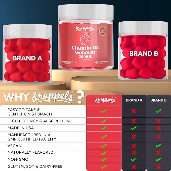 Droppels Vitamin D3 Gummies 2000 IU – Extra Strength, Vegetarian, Pectin Plant-Based Vitamin D Gummies for Bone Health Support – Juicy Strawberry Flavor, 60 Count (1-Month Supply)