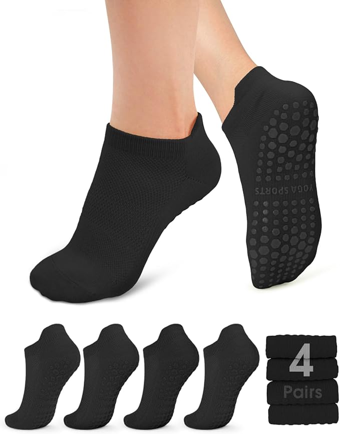 - 【MULTI-USAGE】One Size fits Women’s shoe size 5.5-9. No matter what kind of exercise you do, these adult grippy socks for women are perfect for Yoga, Pilates, Bikram, Barre, Ballet, Trampoline, Travel, Studio, Gym, Dance and more. Also ideal for Hospital, Rehab, Physiotherapy, Elderly Care, Pregnancy and more to prevent falls from stairs, or the floor. If you're looking for these socks, you can stop the search and buy our 4 pack, we are confident that you will love these non slip socks.