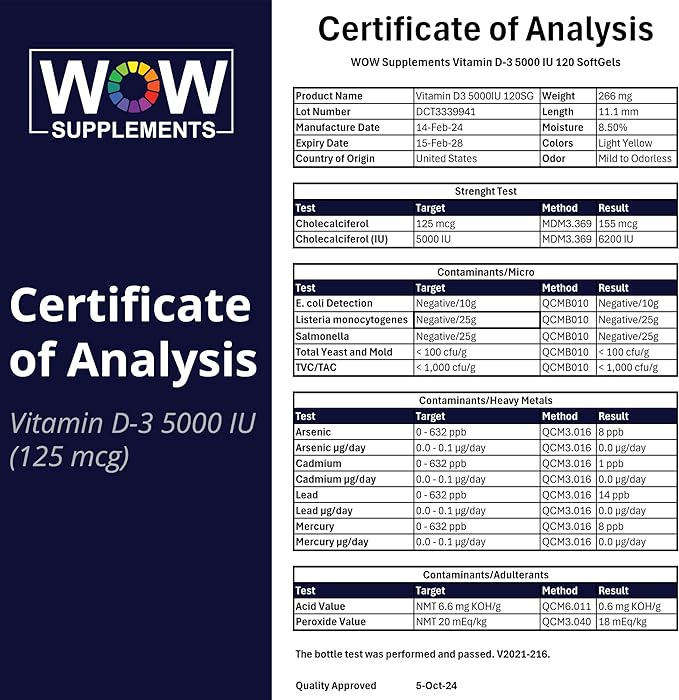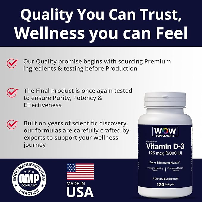 - πππ₯π§πππππ π ππ‘π¨ππππ§π¨π₯ππ‘π: WOW Supplements Vitamin D3 5000 IU softgels are manufactured in the United States in GMP-compliant, NPA A-rated facilities, providing superior quality. Each batch is rigorously tested to ensure potency and stability.